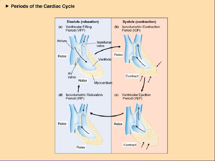 Mechanical Events of the Cardiac Cycle Ventricular Filling Period [ventricular diastole, atrial systole] 2. Isovolumetric Contraction Period [ventricular systole] 3. Ventricular Ejection Period [ventricular systole] 4. Isovolumetric Relaxation Period [ventricular diastole, atrial diastole] 1.