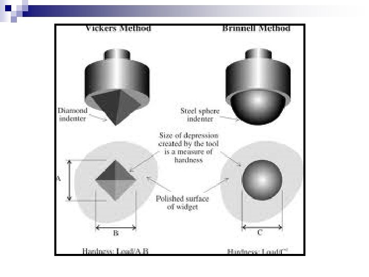 1. Brinell hardness test • Shape of indentor: Sphere • Indentor material: Tungestun or carbide • Size of indentor: 1. 6 mm in diameter • Type of indentor: Macro-indentor • Measurement: Depth of indentation