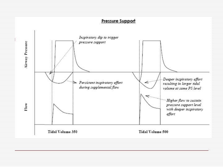 Pressure Support o Respiratory rate is completely patient dependent o Machine augments the patient’s breath by at a flow rate which adjusts itself to the patient’s effort. o A relatively constant, preset airway pressure is sustained during inspiration. o This added flow is terminated when the patient exhales. o Can deliver high or low level support.