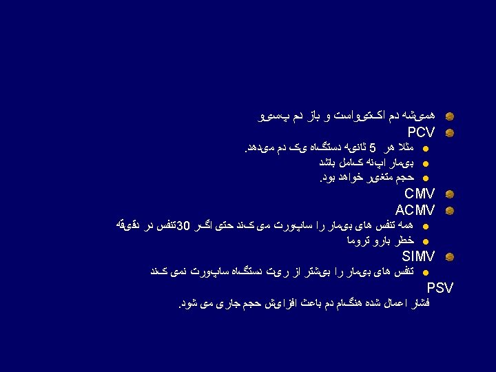 PCV: pressure controled Ventilation CMV: controled mode ventilation ACMV: Assist controled mode ventilation SIMV: spontanous intermittent mandatory ventilation PSV: pressure support ventilation ASV: asssist spontanous ventilation