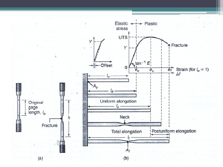 • Two stress values are important in engineering design. ▫ The yield strength, σys, is the limit of elastic deformation; beyond this point, the material “yields, ” or permanently deforms. ▫ The ultimate tensile strength, σUTS (also called tensile strength, σTS) is the highest stress value on the stress -strain curve. • The rupture strength is the stress at final fracture; this value is not particularly useful, because once the tensile strength is exceeded, the metal will break soon after. • Young’s modulus, E, is the slope of the stress-strain curve before the test specimen starts to yield. • The strain when the test specimen breaks is also called the elongation.