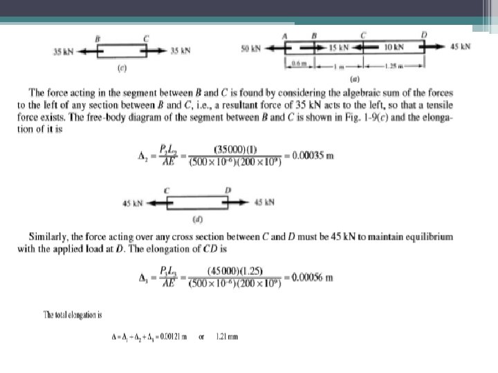 Deformation of a body due to self weight In Fig determine the total increase of length of a bar of constant cross section hanging vertically and subject to its own weight as the only load. The normal stress (tensile) over any horizontal cross section is caused by the weight of the material below that section. The elongation of the element of thickness dy shown is where A denotes the cross-sectional area of the bar and γ its specific weight (weight/unit volume). Integrating, the total elongation of the bar is where W denotes the total weight of the bar. Note that the total elongation produced by the weight of the bar is equal to that produced by a load of half its weight applied at the end.