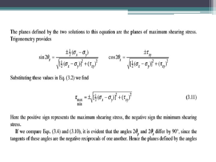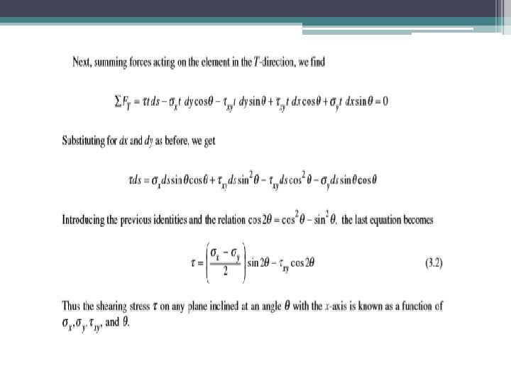 If moments are taken about the center of the face shown, we would see that τxy = τyx since the normal stresses pass through the center. We shall assume that the stresses σx , σy and τxy are known. Frequently it is desirable to investigate the state of stress on a plane inclined at an angle θ, measured counterclockwise to the x -axis, as shown in Fig. 3 -1. The normal and shearing stresses on such a plane are denoted by σ and τ and appear as in Fig. 3 -2.