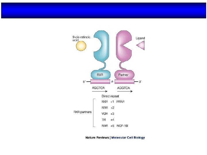 HORMONE RESPONSE ELEMENTS Steroid receptors Pal AGAACA nnn TGTTCT AGGTCA Monomeric receptors TGACCT AGGTCA A/T Nonsteroid receptors Pal DR AGGTCA n nn nnnnn DR 1 DR 2 DR 3 DR 4 DR 5 (PPAR, RXR) (RAR) (VDR) (TR) (RAR)