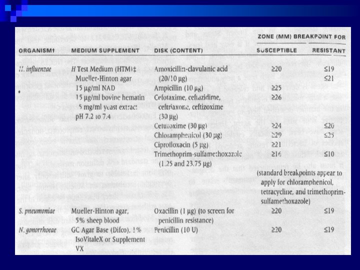 Factors Affecting Size of Zone of Inhibition n Inoculum density Larger zones with light inoculum and vice versa n Timing of disc application If after application of disc, the plate is kept for longer time at room temperature, small zones may form n Temperature of incubation Larger zones are seen with temperatures < 35 o. C n Incubation time Ideal 16 -18 hours; less time does not give reliable results n Potency of antibiotic discs Deterioration in contents leads to reduced size n Composition of medium Affects rate of growth, diffusion of antibiotics and activity of antibiotics