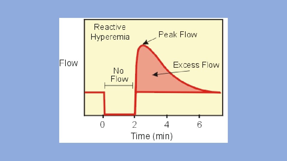 Reactive hyperemia • Increase in blood flow in response or reacting to a prior period of decreased blood flow or • Reactive hyperemia is the transient increase in organ blood flow that occurs following a brief period of ischemia (e. g. , arterial occlusion) • The longer the period of occlusion, the greater the metabolic stimulus for vasodilation leading to increases in peak reactive hyperemia and duration of hyperemia.