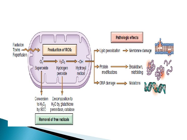 Oxidative Stress � Cellular abnormalities induced by ROS (free radicals) � Chemical species with single unpaired electron (extremely unstable) � ROS generated in: � Chemical injury (CCL 4) � Radiation injury (UV, Xray) � Hypoxia � Cellular aging � Inflammation � Ischemia-reperfusion injury.