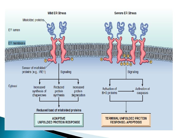 Endoplasmic Reticulum Stress � Chaperones � Misfolded in ER control proper protein folding proteins >> ubiquinated >> targeted to proteolysis � Unfolded protein response (adaptive response): increase chaperones production and decrease protein translation � If failed >> proapoptotic sensor activation (BH 3 -only family) + direct activation of caspases >>apoptosis by the mitochondrial pathway.