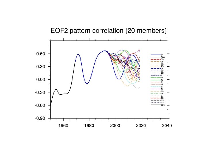 Decadal predictions of IPO index for the Pacific 9 out of 29 members (31%) show some predictive skill out to 20 years (CCSM 3. 0, T 42, atmospheric initial state perturbed with same ocean initial state at year 2000; one reference, 29 ensemble members)