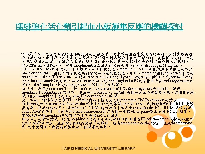 Mechanisms of morphine potentiated agonistinduced platelet aggregation in human platelets n The discovery of pharmacological activity of morphine early in the 19 th century and the demonstration of its potent analgesic properties. Morphine had been used to relax the pain of cancer patients on the last phase , and dealed with some serious diseases、trauma and surgery was needed. However, how the influence of morphine on wash human platelets, and what are the mechanisms involved in this influence, it still remains unclear. Recently the subject had not been discussed widely. The aim of this thesis is to further investigate the detailed mechanisms of morphine on human platelets. In our studies, we found that morphine (1, 5 �M) dose—dependently potentiated platelet aggeregation and ATP release by collagen (1 �g/ml) and U 46619 (0. 5 ���� in human platelet suspensions. Morphine (5 �M) potentiated [3 H��� inositol monophosphate formation stimulated by collagen (5 �g/ml) in [3 H��myoinositol loaded platelets. Furthermore, morphine also potentiated [Ca 2+]i mobilization in human platelet suspensions stimulated by collagen (1 �g/ml). At the same dose, morphine significantly potentiated thromboxane B 2 formation of collagen-activated platelets. Consequently, we measured prostagladin. E 2 formation as an index of cyclooxygenase activity. We found that morphine had no significant effect on cyclooxygenase activity, and found it did not potentiate collagen-induced platelet aggregation in the presence of yohimbine. According to these results, we found the effect of morphine on human platelets may be mediated via activation of ��� adrenoceptors. On the other hand, morphine (1, 5 ��) inhibited prostaglandin E 1 (10 ������ induced cyclic AMP increase in human platelets. We examined this potentiation involved in platelet signal transduction system such as Na�/H� pump in human platelet suspensions. In contrast, morphine did not significantly increase nitrate formation in human platelets. Moreover, we found morphine did not influence the binding of FITC-triflavin to platelet glycoprotein IIb/IIIa complex. Triflavin, an Arg-Gly-Asp-containing antiplatelet peptide, was purified from Trimeresurus flavoviridis snake venom. Measurement of the platelet membrane fluidity, we found that morphine did not significantly affect the platelet membrane fluidity diphenylhexatriene (DPH)-loaded platelets. Based on the above observations, we suggested that morphine may bind to ��� adrenoceptors in human platelets, resulting in inhibition of cyclic AMP formation and concurrently increased intracellular Ca 2+, resulting in activation of phospholipase A 2 , and increased formation of thromboxane A 2 formation, and potentiation of platelet aggregation.