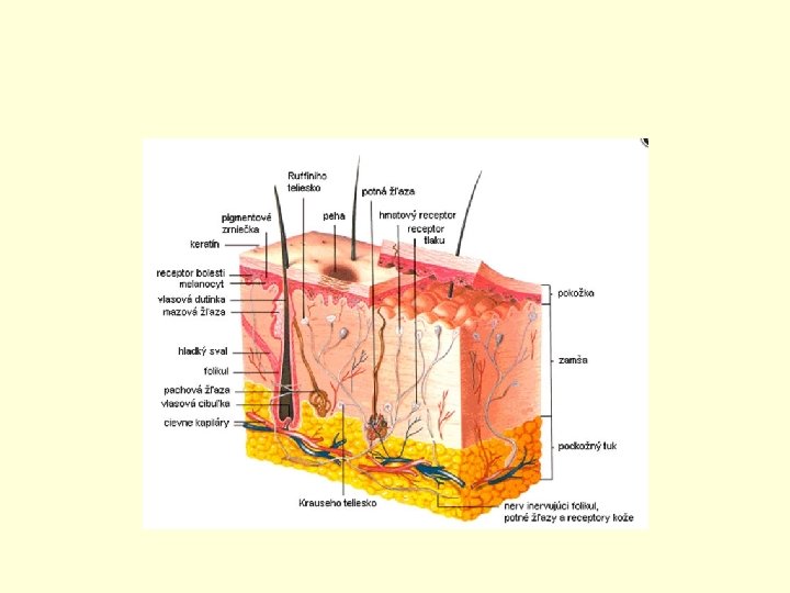 2. TERMORECEPTORY - Informujú o zmene teploty tela v porovnaní s teplotou povrchu tela - rozptýlené v koži po celom tele v Krausovo teliesko – receptor chladu (na povrchu kože) v Rufiniho teliesko – receptor tepla (hlbšie v koži) Človek najviac termoreceptorov – na čele, okolo pier, nosa, predlaktí Hady – na hlave Ostatné cicavce okolo ňufáka