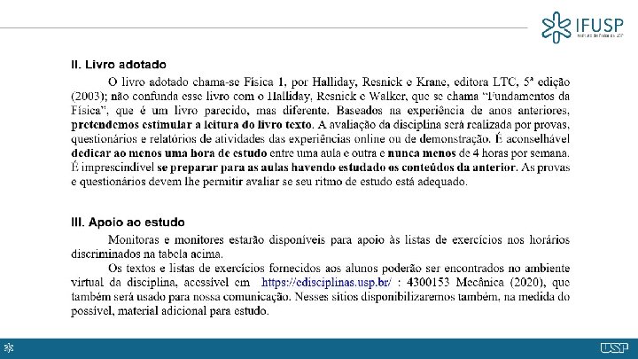 Atividades Regulares Leitura do livro HRK Fazer os exercícios das 10 listas. Participar das monitorias online. Responder os questionários online. Fazer análise e relatórios dos experimentos online – correspondem ao crédito trabalho Outras atividades sugeridas Leitura de livros e artigos científicos Exemplos: Por que o pão cai com a parte com manteiga para baixo ? Análise do chute do Roberto Carlos. Por que a pipoca estoura ? Special Issue: X Rays 100 Years Later (nov. 1995) Applets na Internet sobre demonstrações em física. https: //phet. colorado. edu/pt_BR/simulations/category/physics https: //web 2. ph. utexas. edu/~phy-demo/resources/phys_applets. html