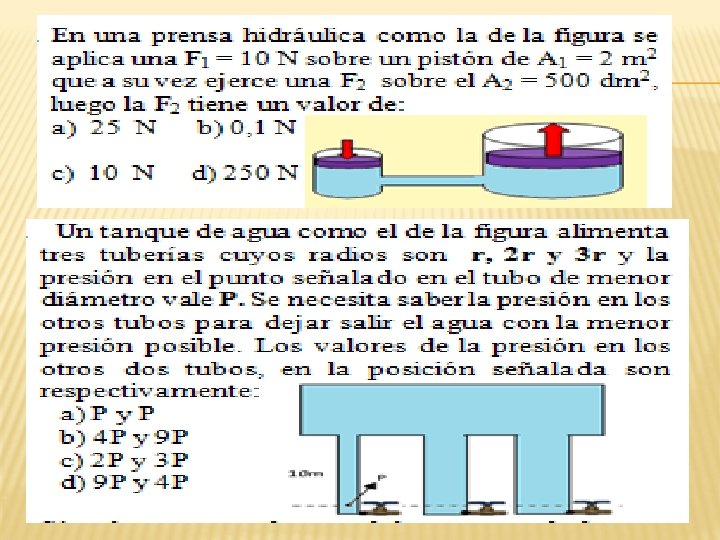 PRINCIPIO DE PASCAL Las secciones de los émbolos de una prensa hidráulica son círculos de radios 5 y 50 cm respectivamente. Aplicando una fuerza de 10 N al émbolo menor, ¿qué fuerza aparecerá en el mayor? Determina el descenso del émbolo menor para que el mayor ascienda 2 cm. Solución: Datos: R 1 = 5 cm; R 2 = 50 cm; F = 10 N; f = ? Aplicando el principio de Pascal: Ahora se necesita saber la superficie de cada uno de los émbolos.