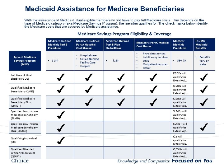 2018 Med. Star Medicare Choice Dual Advantage Benefit Grid (cont) Benefit Med. Star Medicare Choice Dual Advantage (HMO SNP) (District of Columbia) Med. Star Medicare Choice Dual Advantage (HMO SNP) (Maryland) Doctor Office Visits – 0% or 20% coinsurance per visit Primary Care Physician (PCP) and Specialist 0% or 20% coinsurance per visit Outpatient Rehabilitation (e. g. , 0% or 20% of the cost per therapy visit occupational, physical, speech and language therapy) 0% or 20% of the cost per therapy visit Outpatient Surgery Outpatient Hospital Facility – 0% or 20% Outpatient Hospital Facility – 0$ or 20% coinsurance per surgery Ambulatory Surgical Center (ASC) – 0% or 20% coinsurance per surgical visit Emergency Care 0% or 20% of the cost per visit Urgent Care 0% or 20% of the cost per visit Durable Medical Equipment 0% or 20% of the cost per item Diabetic Supplies (Life. Scan Products Only) 0% or 20% of the cost per item NOTE: Depending on Medicaid eligibility, member may not have any cost-sharing responsibility for original Medicare services. If the member looses full status, they may be subject to cost sharing. This grid is for training purposes do NOT distribute to beneficiaries. Grids are not submitted to CMS for approval. A CMS tracking number must be on member materials in order to distribute them. Please do not use Benefit Grid to quote benefits – please refer to the EOC 27