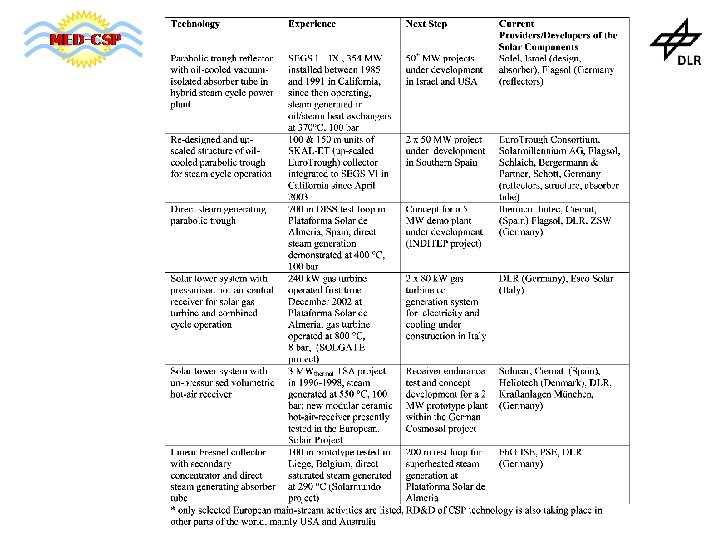 Portfolio of Technologies for the MED-CSP Scenario Wind Power: Wind power can be generated in distributed wind plants of up to 5 MW capacity each, or in large wind parks interconnecting tens or even hundreds of such plants. There are onshore and offshore wind parks, build into the sea where it is not deeper than 40 m. Photovoltaic : PV systems are typically used for distributed or remote power systems with or without connection to the utility grid. Their capacity ranges from a few Watt to several MW. There also scenarios for very large pv systems up to 1. 5 GW each to be build in desert areas until 2050. Both options have been included in the MED-CSP scenario. Geothermal Hot Dry Rock: Geothermal heat of over 200 °C can be delivered from up to 5000 m deep holes to operate organic. Rankine cycles or Kalina cycle power machines. Unit sizes are limited to about 100 MW maximum. Biomass Power Generation: Biogas from municipal waste or solid biomass from agricultural or municipal residues and from wood can be used for electricity generation. Their size is usually below 25 MW each. Hydropower: Hydropower is already applied in many MENA countries. It ranges from large multi-Megawatt dams like Aswan to micro-hydropower schemes of several k. W capacity. Solar Thermal Electricity: Concentrating solar thermal power (CSP) stations are steam cycle, gas turbine or combined cycle power stations fired with high temperature, concentrated solar energy. Their thermal storage capability and hybrid operation with fuels allows them to provide power on demand. Solar chimneys are also considered as solar thermal power plants, though not concentrating. CSP plants can be build from several k. W to several 100 MW capacity. CSP can be used for co-generation of electricity and heat. Oil and Gas fired Power Plants: Oil and gas can be used in steam cycle, gas turbine or combined cycle power plants. All thermal plants can be used for co-generation of electricity and heat. They are build in all capacity classes from several k. W to several 100 MW. Coal Steam Plants Only a few countries in MENA use coal fired steam cycles. Coal must be imported. Capacities range from some 10 to several 100 MW. Nuclear Fission and Fusion Nuclear plants use nuclear fission processes to generate steam for steam turbines. There is intensive research on nuclear fusion aiming at providing first results in terms of a first power plant in the year 2050 or beyond. Projected units sizes are in the GW capacity range.