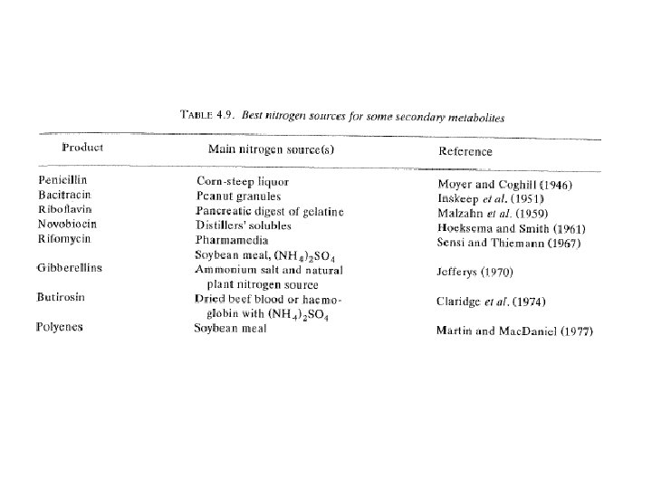 Factors influencing the choice of N source • Control mechanism exist by which NO 3 reductase an enzyme involved in the conversion of NO 3 to NH 4 ion, is repressed in the presence of NH 3. • In Aspergilus nidulans NH 3 also regulates the production of alkaline & neutral proteases. • In Antibiotic production by many microorganism is influenced by the type and concentration of the N in the culture medium. • Antibiotic production may be inhibited by a rapidly utilized N source (NH 4, NO 3). • Antibiotic production only begins to increase in the culture broth after most of the N consumed. • E. g in the production of polyene antibiotic, soybean has been considered a good N source b/c of the balance of the nutrients, low P content & slow hydrolysis. This gradual breakdown prevent the accumulation of NH 4 ions & repressive AA. • Some complex N material cant be utilized by a micro-organism & create problems in downstream processing & effluent treatment. This can be an important factor in the final choice of substrate.