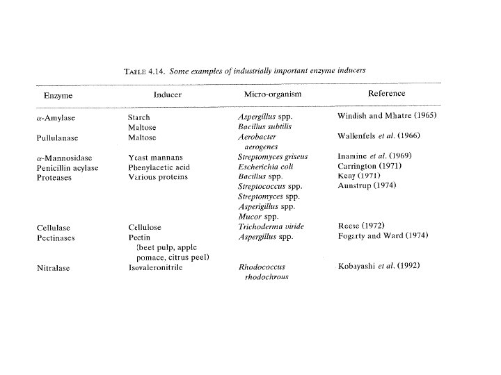 Inducers • The majority of enzymes which are industrial interest are inducible. • Induced enzymes are synthesized only in response to the presence in the environment of an inducer. • Inducers are often substrate such as starch or dextrins for amylase, maltose for pullulanase & pectin for pectinase. • Most inducers which are included in microbial enzyme media are substrate or substrate analogues but intermediates and products may sometime be used as inducers. • E. g maltodextrins will inudce amylase & fatty acids induce lipase. (use depend upon the cost) • It is not possible to produce a no of heterologous protein (HLP) in yeasts, fungi & bacteria. But HLP may show some degree of toxicity to the host, it may restrict the growth and biomass. • One commercial system based on the alc A promoters in aspergillus nidul-ans to express human interferon alpha 2. this can by induced by volatile chemicals i. e ethylmethyl ketone added when biomass increase to an adequate level.