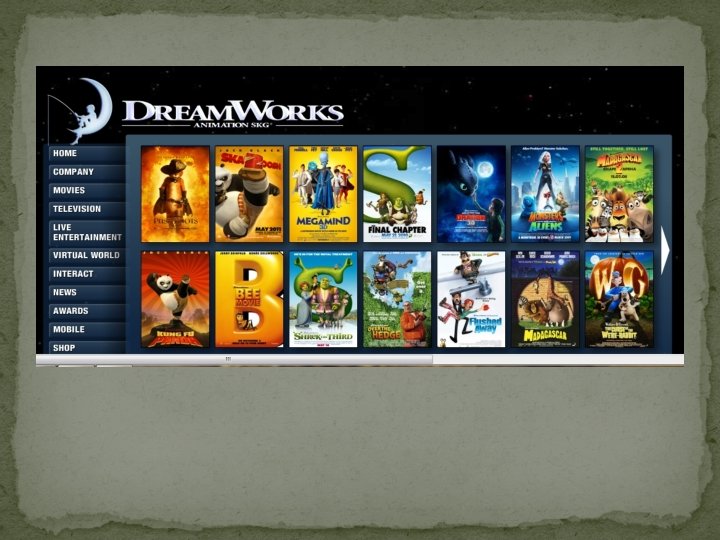 � Dream. Works Animation SKG, Inc. is an American animation studio based in California. � It creates animated feature films, TV programs and online virtual worlds. � Released a total of 27 feature films including Shrek, Madagascar, Kung Fu Panda, Monsters vs. Aliens, etc � As of June 2013, its feature films have made $11 billion worldwide, with its $430 million average gross surpassing all other studios besides Pixar ($595 million). � Three of Dream. Works Animation's films—Shrek 2, Shrek the Third, and Shrek Forever After—are among the 50 highestgrossing films. And fifteen of the films are among the 50 highest-grossing animated films, with Shrek 2 being the fourth all-time highest. � Even though the studio also made traditionally animated films earlier, all of their films now utilize computer-animation. � The studio has so far received two Academy Awards along with numerous Annie & Emmy Awards; as well as multiple Golden Globe & BAFTA nominations.
