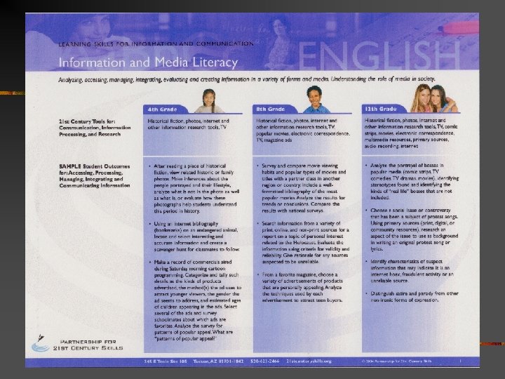 Endorsing media literacy American Association of School Librarians Annenberg Public Policy Center Carnegie Commission on Adolescent Development Center for Substance Abuse Prevention College Board Standards for Student Success International Reading Association National Board for Professional Teaching Standards National Council for Teachers of English National Council for the Social Studies National Middle School Association National PTA North Central Regional Educational Laboratory (Nc. REL) Partnership for 21 st Century Skills White House Office of National Drug Control Policy
