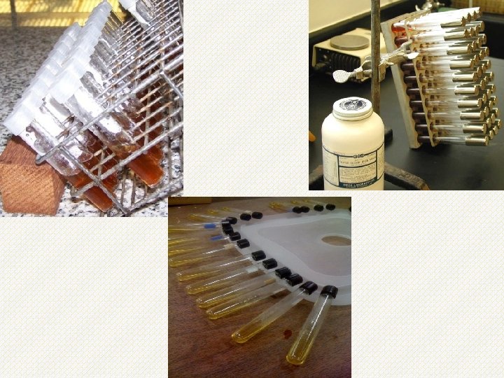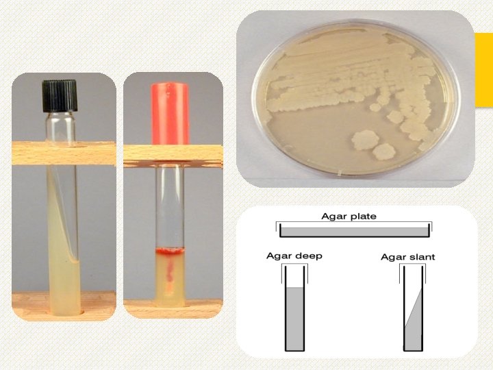 2) Slant tubes: are tubes containing a nutrient medium plus a solidifying agent, agar-agar. The medium has been allowed to solidify at an angle in order to get a flat inoculating surface. 3) Stab tubes (deeps): are tubes of hardened agar medium which are inoculated by "stabbing" the inoculum into the agar. 4) Agar plates: are sterile petri plates that are aseptically filled with a melted sterile agar medium and allowed to solidify. Plates are much less confining than slants and stabs and are commonly used in the culturing, separating, and counting of microorganisms.
