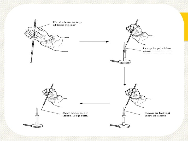 v Sterilize both instruments by holding the wire portions in a flame until they glow red. The instruments should be allowed to cool in the air for 10 -20 seconds before using them to avoid killing the inoculum. v In this way all contaminants on the wire are incinerated. ü Do not blow on the instruments to cool them ü Do not touch the instruments to agar to cool them ü Do not lay the loop down once it is sterilized or it may again become contaminated.