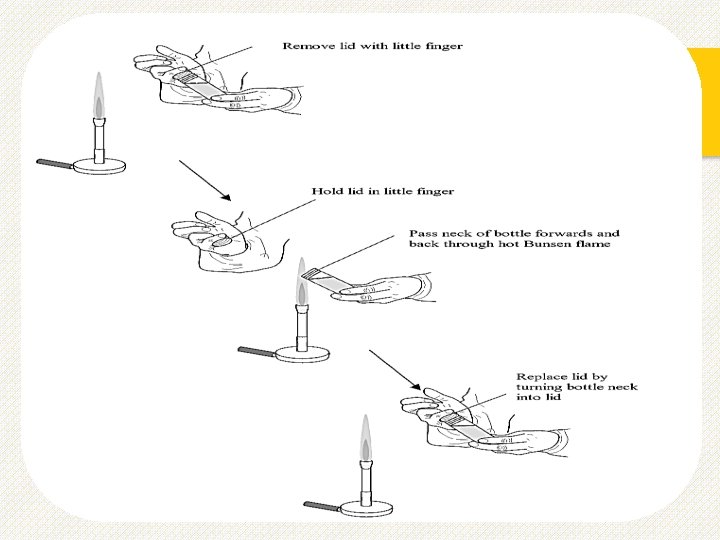 Procedure For Aseptically Transfer 1) Flame the loop. 2) Without setting the loop down, open the first culture tube and flame the mouth. Do not set the cap on the bench. The cap should be held in the same hand as the loop. 3) Insert the loop into the culture medium, then withdraw it. 4) Flame the mouth of the first culture tube again, and replace the cap. 5) Open the second culture tube and flame the mouth. Do not set the cap on the bench. The cap should be held in the same hand as the loop.