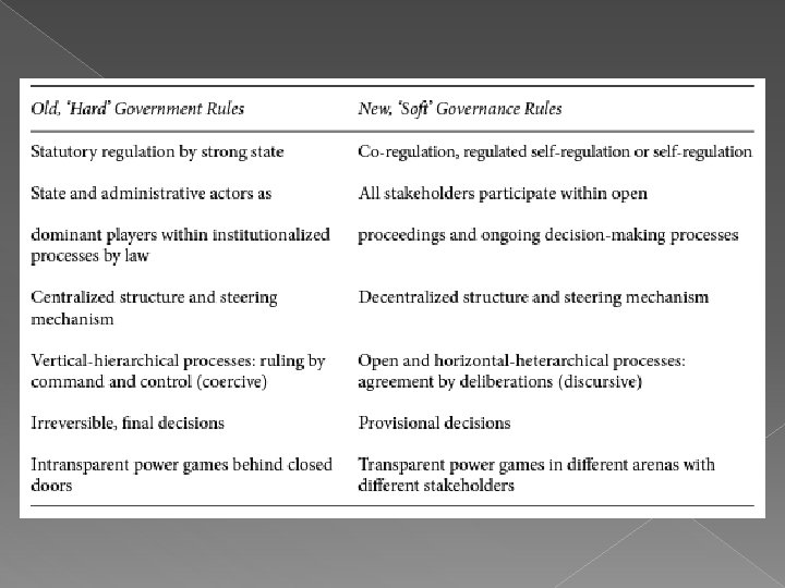 Towards a governance model “(…) media governance looks beyond government, market and corporate media management. Especially, media governance focuses on non-governmental modes of institutionalization and organization, on civil society organizations, as well as on the public. Media governance emphasizes the self- and co-regulation modes of media policy. ” (Media in Europe Today, 159) It is about bottom-up approaches and horizontal codetermination of political issues