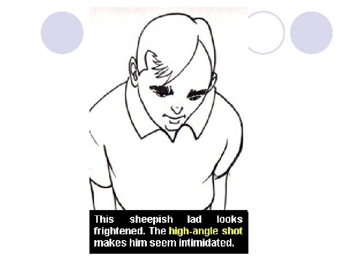 High Angle Shots l High-angle shots are basically the opposite of low-angles, both figuratively and literally. If you want to create a feeling of weakness with a school nerd being threatened by the bully, draw a subjective shot (camera is part of the action). Draw the nerd from a high angle, with him looking up toward the "camera" (which are the eyes of the bully. ) The figure seems intimidated, or inferior to your audience.