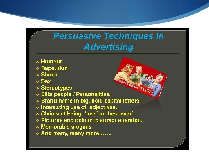 5. Facts and Figures S The media use facts and figures in order to show credibility. S They convince you of something by showing you data. S However, the data can be misleading or can exclude important information.