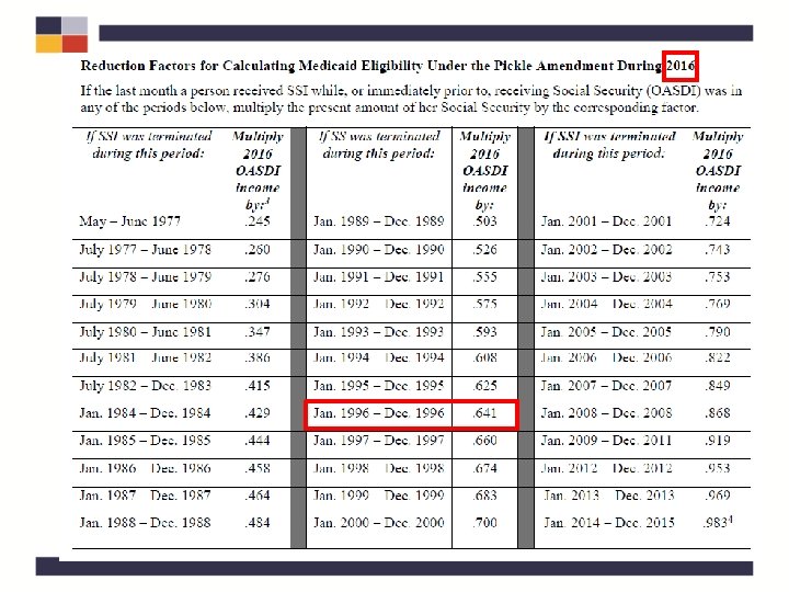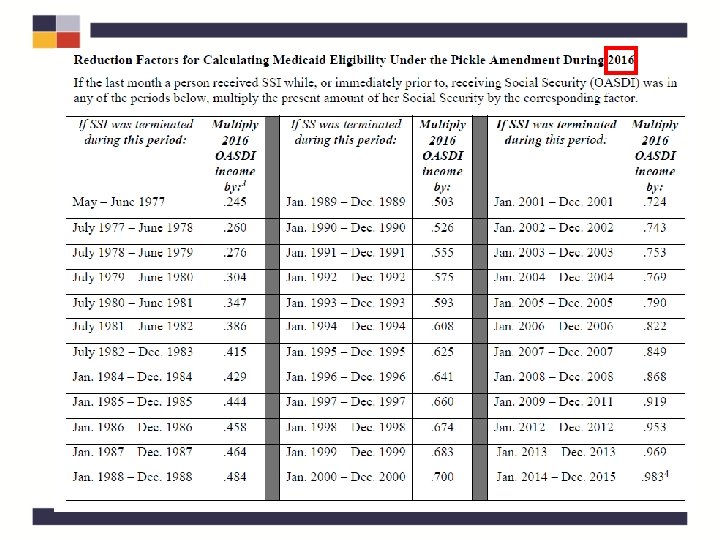 Pickle Calculations • Using the “Reduction Factors for Calculating Medicaid Eligibility Under the Pickle Amendment During 2016” chart, determine the amount of countable income