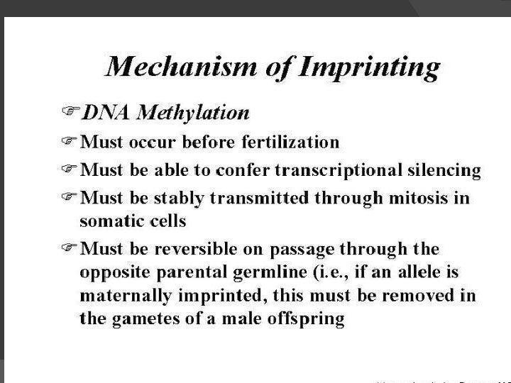 Imprinting Normally at a given locus we have two alles one from mother and the other from father Definition: At a single locus, only one allele is active, the other is inactive.