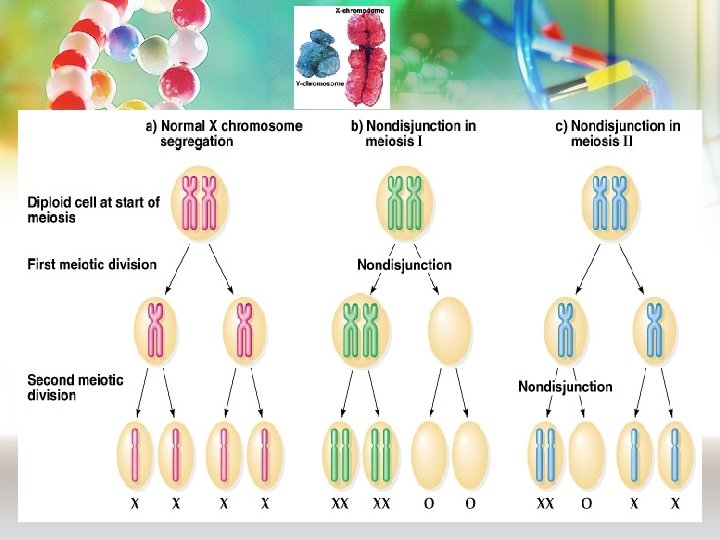 Meiotic non-disjunction § can affect each pair of chromosomes § is not a rare event § non disjunction in first meiotic division produces 4 unbalanced gametes. § non disjunction in second division produces 2 normal gametes & 2 unbalanced gametes