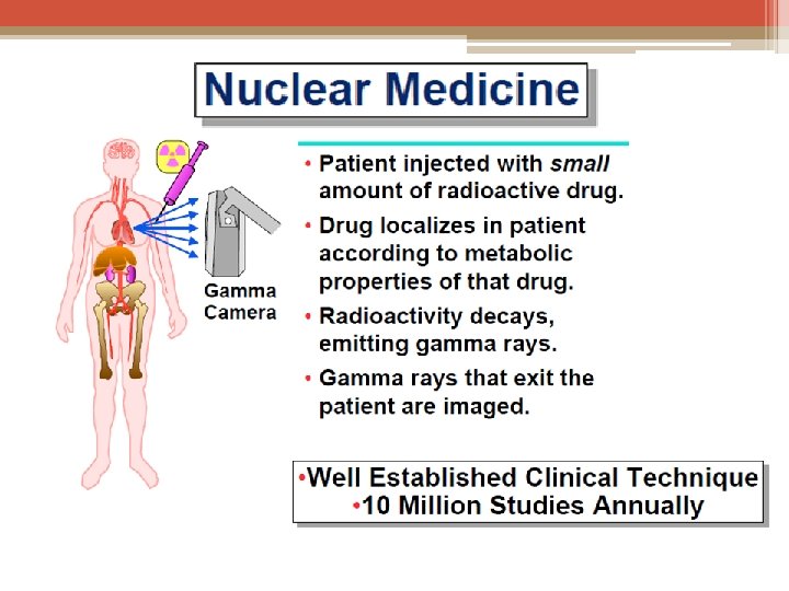Nuclear Imaging • Nuclear imaging is unique in that the means of visualization are not external waves delivered to the body. Rather, electromagnetic waves are emitted from within. In general, a radioactive marker is introduced into the patient's bloodstream and accumulates in the organ of interest. The marker gives off gamma rays that are detected by a special camera and processed into images by a computer. Nuclear Imaging This type of imaging is also unique in that nuclear medicine physicians, not radiologists, are the ones who interpret nuclear imaging studies. Applications of nuclear imaging include perfusion of the heart, activity of the thyroid gland, and late-stage cancer.