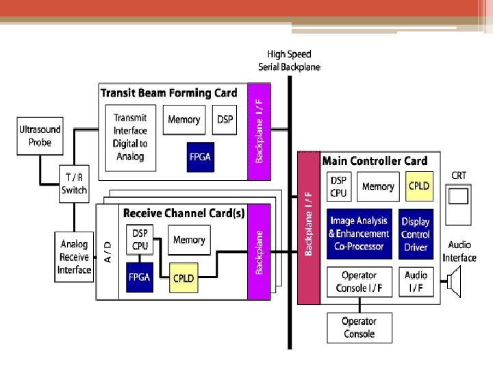 Generic Ultrasonic Imaging System Transmitter –Arbitrary waveform. –Programmable transmit voltage. –Arbitrary firing sequence. –Programmable apodization, delay Receiver –Programmable apodization, delay control and frequency control. –Arbitrary receive direction. • Image processing: –Pre-detection filtering. –Post-detection filtering. • Full gain correction: analog and digital. • Scan converter: various scan format.