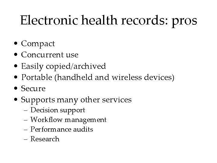 Electronic health records: pros • • • Compact Concurrent use Easily copied/archived Portable (handheld and wireless devices) Secure Supports many other services – – Decision support Workflow management Performance audits Research