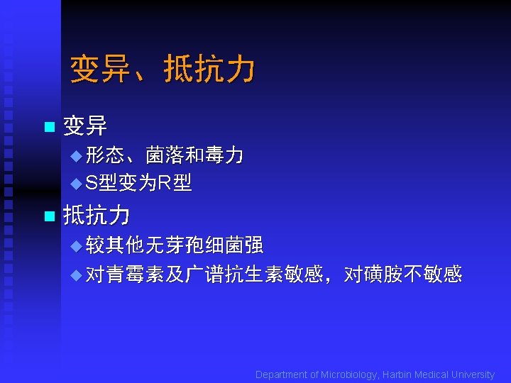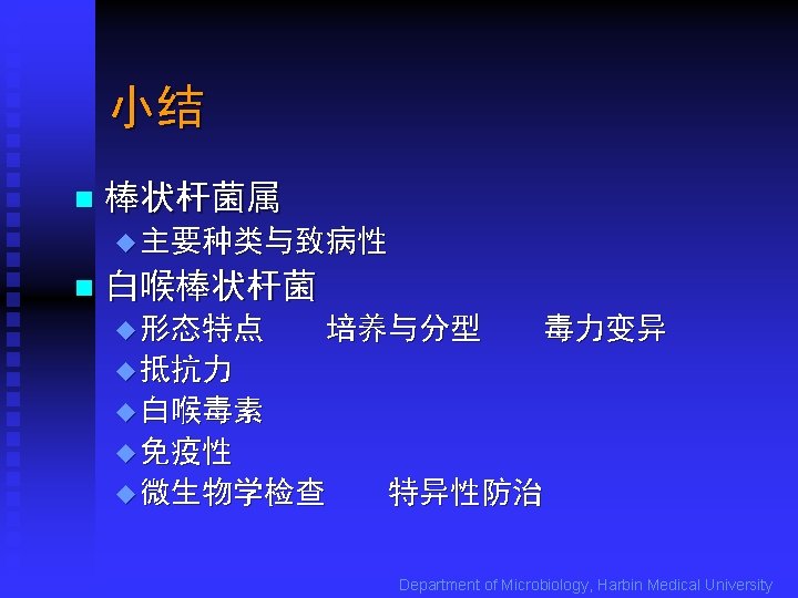 防治原则 n 人 自动免疫 n 人 被动免疫 n 抗菌治疗 Department of Microbiology, Harbin Medical University
