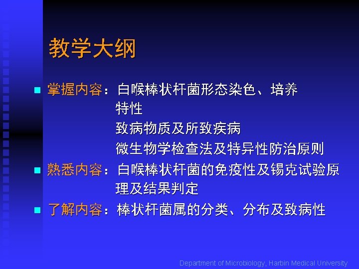 棒状杆菌属 Corynebacterium n 白喉棒状杆菌(C.dephtheriae) n 类白喉杆菌(diphtheroid bacilli) Department of Microbiology, Harbin Medical University