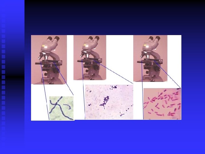 Morphological n Non-stained microscopic observation u Dark-field microscopy u Observing the movement of live bacteria n Stained microscopic observations u Gram stain u Acid-fast stain u Fluorescence stain