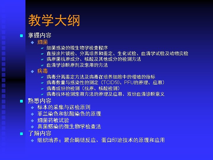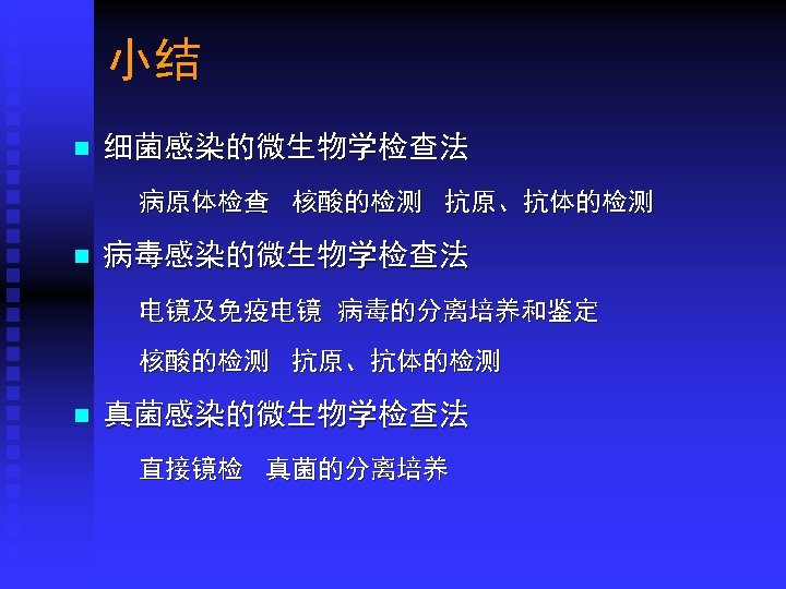 Principles for Specimen Collection n n Sterile manipulation, avoid contamination Obtain a specimen u u u n Double sera for antibody detections, acute and recovery phase each u n from the infected site according to the disease phase before administrating antibiotics Positive if the titer of the later specimen is above 4 X to the first specimen Transport, and store correctly u u u as soon as possible Store at -4 o. C for most bacterial specimens, but keep warm for Neisseria meningitidis and Neisseria gonorrhoeae Store at -4 o. C ~ -70 o. C for viral specimens