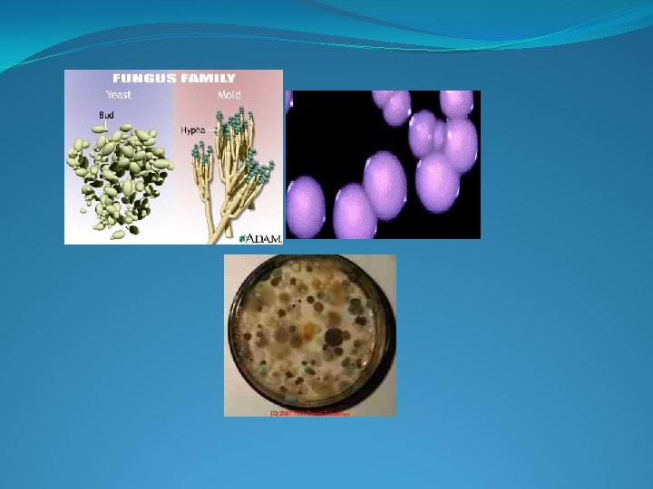 Molds (filamentous) Molds (Mould): classified as moniliaceous (white in color) or dematiaceous (dark in color). hyphae (singular, hypha), long, slender, branching tubes. If hyphae have cross walls, the fungus is said to be Septate. If cross-walls are not present, the fungus is said to be non-septate (coenocytic). Interwoven hyphae known as mycelium Example of mold: Aspergillus sp Rhizopus sp Penicillium sp Spores and conidia are the results of asexual or sexual reproduction; they are used for the identification of the mold based on their shapes, sizes and relationship to the parent hyphae. Culture: it grows on the surface of the plates as one colony. The visible surface growth assumes a fluffy character known as mycelium. Dimorphic fungi: are mold at room temperature and yeasts at 37 oc. Example: Coccidioides imitis Histoplasma capsulatum