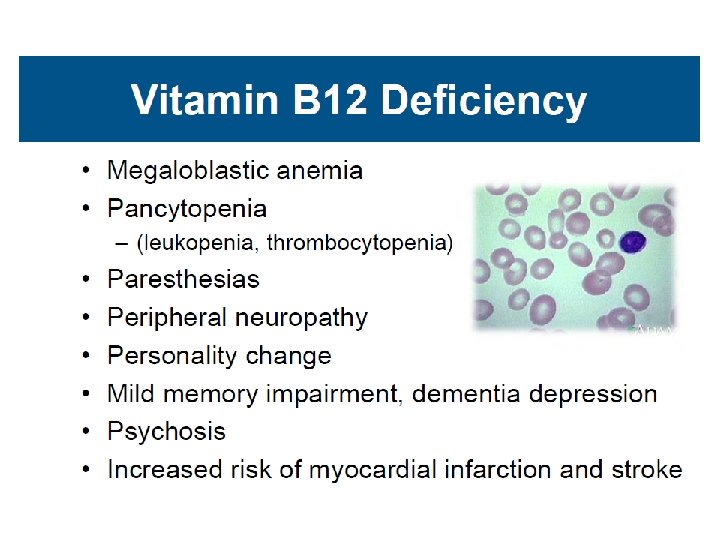 Vit B 12 • Vitamin B 12 insufficiency is common, especially in people 55 or older, vegetarians, or anyone on acid blocking medication. • MMA in urine to evaluate B 12 need. Serum B 12 has a low predictive value for actual vitamin B 12 deficiency. • Elevated MMA identifies B 12 as insufficient, and as it turns out urine and serum MMA are very closely correlated.