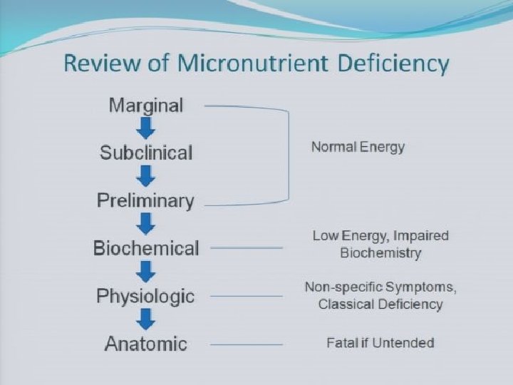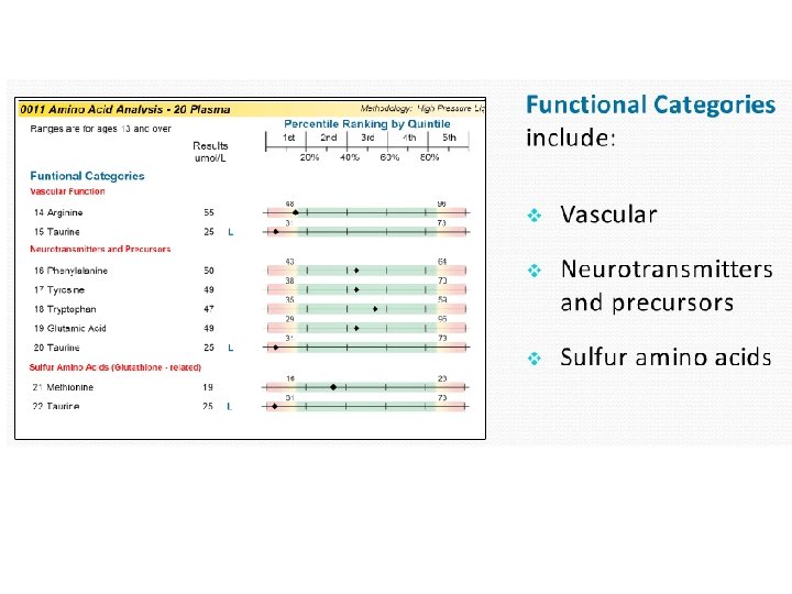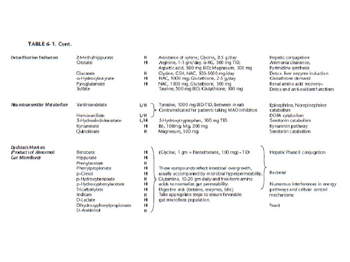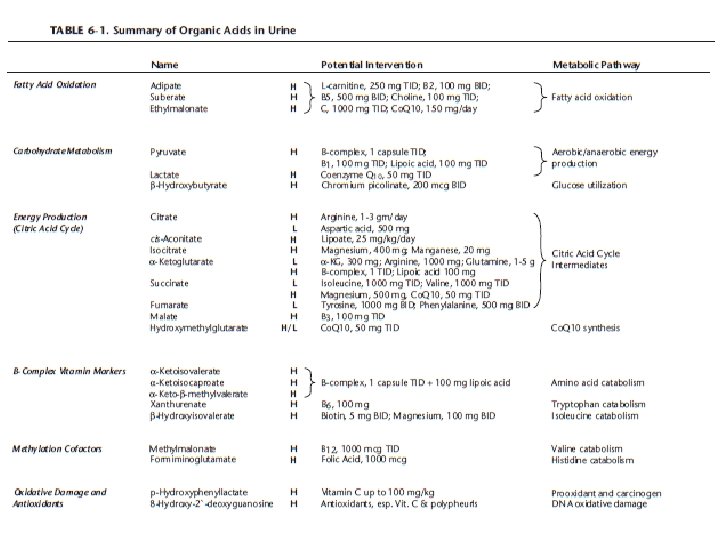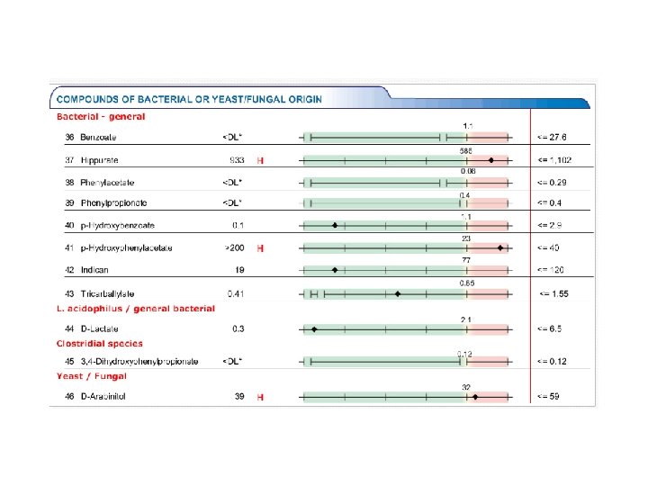 Organix evaluation • the 7 steps of on Organix evaluation: 1. Mitochondrial Function and Assessment 2. B-Complex Vitamin Markers 3. Methylation Pathway Markers 4. Neurotransmitters Metabolism Markers 5. Oxidative Damage and Antioxidant Markers 6. Detoxification Markers 7. Intestinal Dysbiosis Markers
