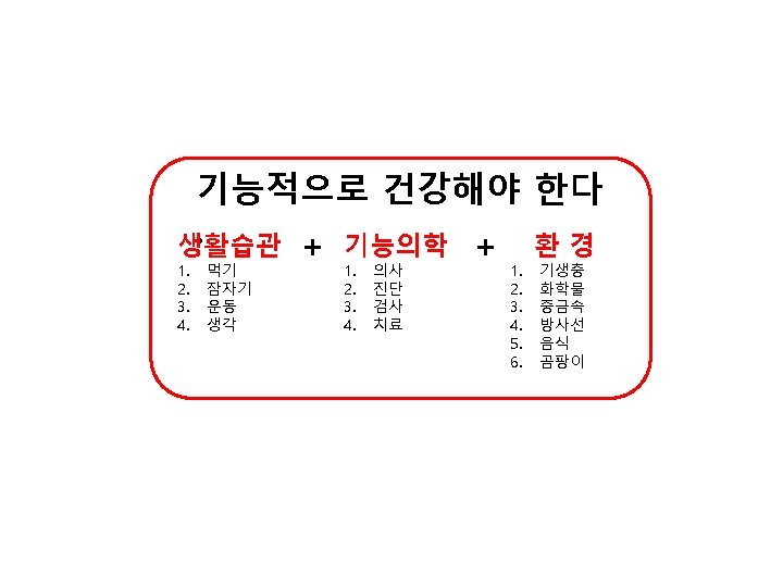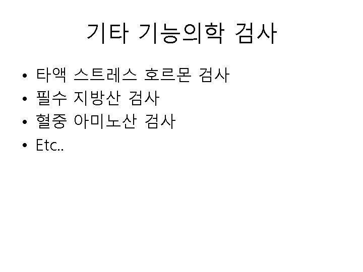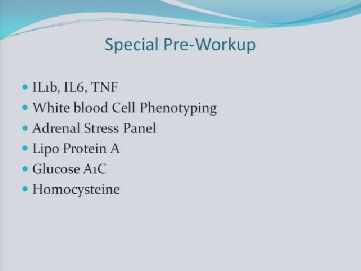 기본 혈액 검사를 통한 스크린 • • • CBC D/C LFT and Kidney Panel Thyroid Function Test Lipid Panel 철분대사 : 철분, Ferritin 비타민 D : 25 -OH cholecalciferol 미네랄 : Na, K, Ca, Cl, Mg, Zn Hgb A 1 C hs. CRP Fibrinogen Homocysteine 기타 일반 생화학 검사 • • • Vit D 저하 미네랄 저하 장누수증후군 Oxidative Stress Subclinical Hypothyroidism 간, 신장기능장애 만성 염증 당뇨 비타민 B군 저하 미네랄 부족 등…. .