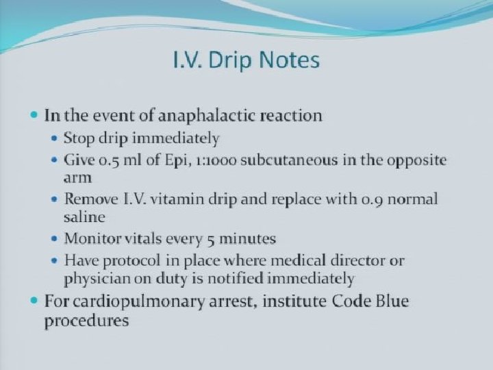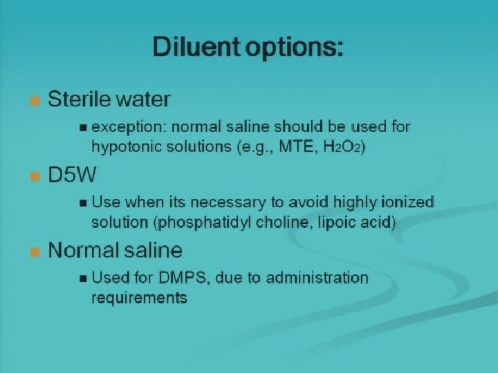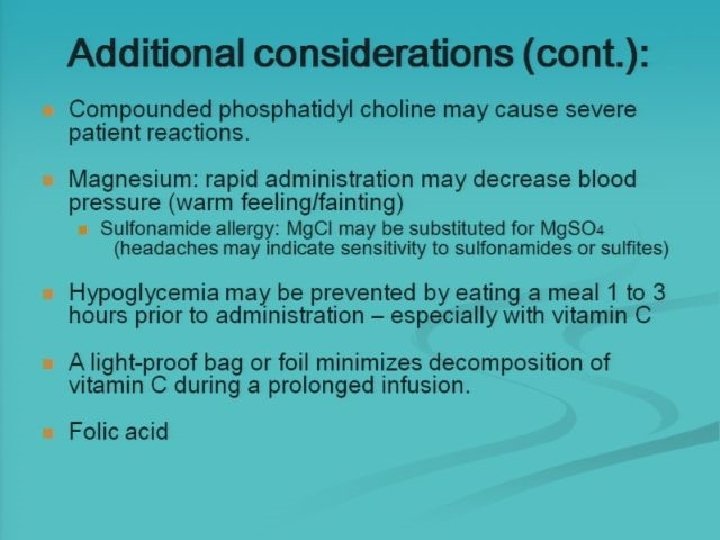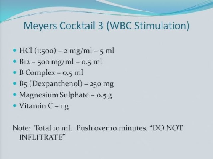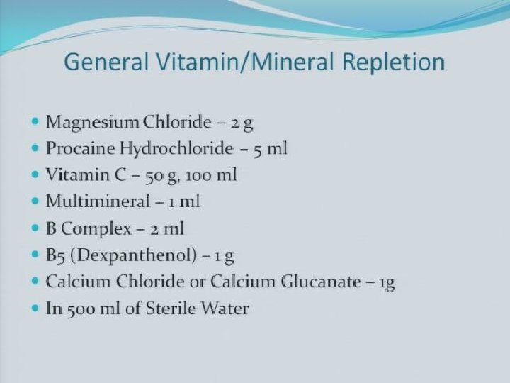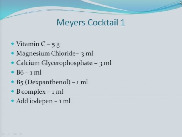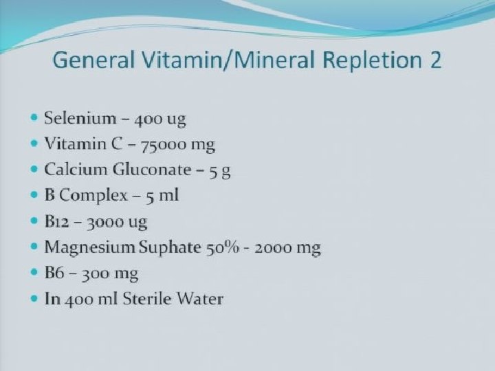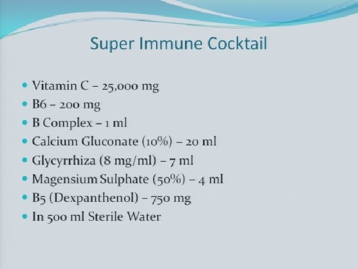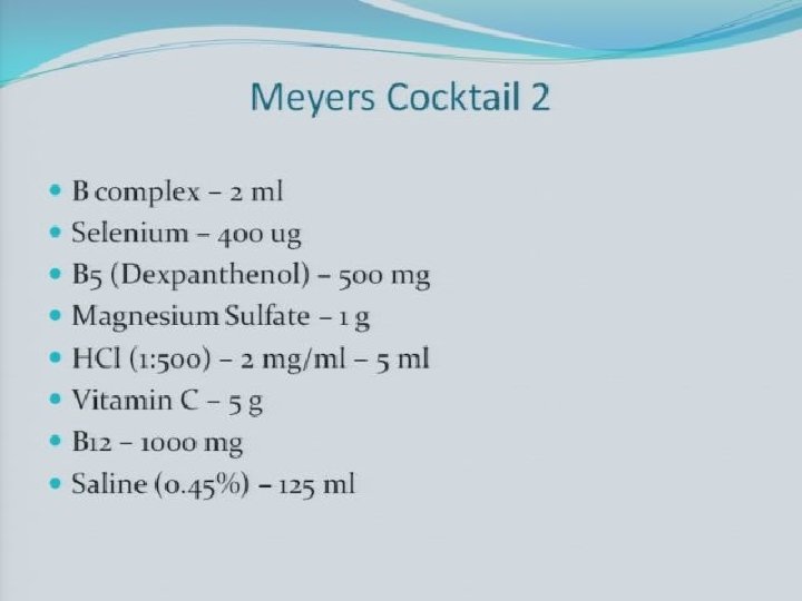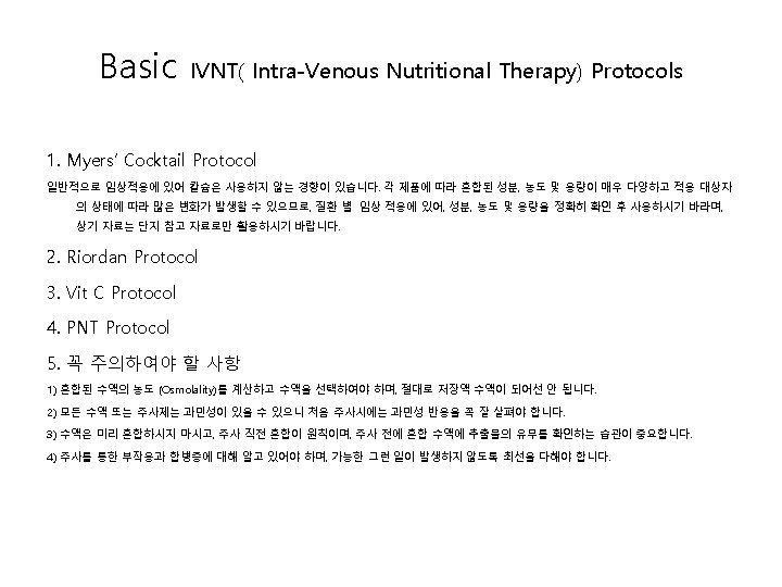 Myers’ Cocktail Protocol Vitamins 영양 질환 (ml) 222 mg 250 mg 100 mg B 6 B 12 1 mg B 1, B 3 100 mg/B 2, 5, 6 2 mg B-complex 100 20%Mg. Cl 3% Calcium Gluconate 6 1 1 4 2 천식 15 2 1 2 2 5 - 편두통 10 2 1 2 4 3 -5 10 피로 15 2 1 2 4 5 5 급성 간염 (Viral) 15 2 1 2 4 3 5 섬유근통 10 2 1 2 4 5 10 심혈관 질환 10 2 1 2 4 4 10 감기 (URI) 1015 1 1 1 2 2 5 만성 부비동염 10 1 1 1 2 2 5 알레지성 비염 15 2 1 2 2 3 - 만성 두드러기 15 1 1 1 2 3 - 일반적인 경우 C B 5 Minerals