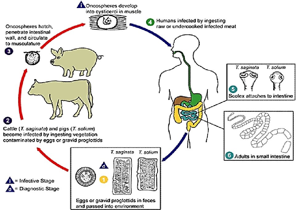 • The human host become infected when the larval cyst (cysticercus) is ingested with poorly cooked infected meat. Whenever the larva escapes the cyst and passes to the small intestine where it attaches to the mucosa by the scolex suckers. The proglottids start in development and the worm matures in 3 to 4 months. • The adult worm may live in the small intestine as long as 25 years. During this period, the gravid proglottids pass with the feces. Eggs extruded from the proglottid contaminate and persist on vegetation for several days and when consumed by cattle they hatch and form cysticerci.