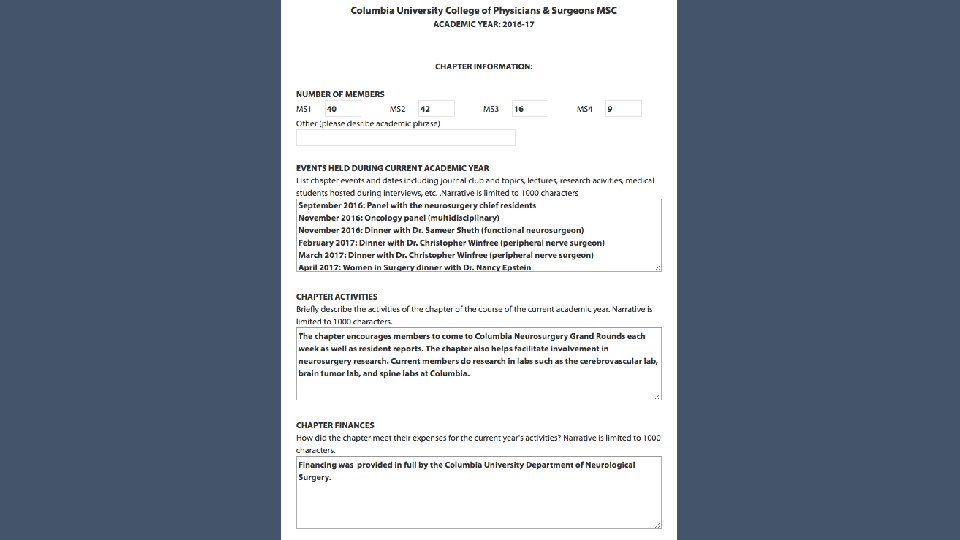 Columbia Neurosurgery Interest Group Activities • Facilitate attendance at all Neurosurgery teaching events • Monthly dinner talks • Variety of clinical topics • Informal setting • Weekly case conferences – with resident or 4 th yr medical student • Basic fundamentals – imaging, path anatomy • 4 th year medical students important for residency information (most knowledgeable because just through process) • Strong mandate to pay it forward • Find mentors • Members: MS 1– 40; MS 2 -42; MS 3 -16; MS 4 -9 • Financed by Dept. of Neurosurgery