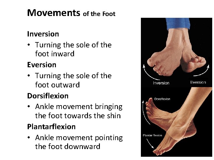 Movements of the Foot Inversion • Turning the sole of the foot inward Eversion • Turning the sole of the foot outward Dorsiflexion • Ankle movement bringing the foot towards the shin Plantarflexion • Ankle movement pointing the foot downward