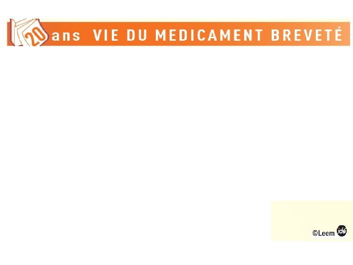 MÉDICAMENT ORIGINAL OU PRINCEPS • Nouveau médicament • Nouveau produit pharmaceutique : protection par un brevet • La société détentrice du brevet : droit exclusif de la production et commercialisation • Une durée maximum de 25 ans : de la découverte de la molécule chimique (principe actif) à son développement (10 à 15 ans de recherche) pour obtenir l’autorisation de mise sur le marché (AMM) à la commercialisation (10 à 15 années).
