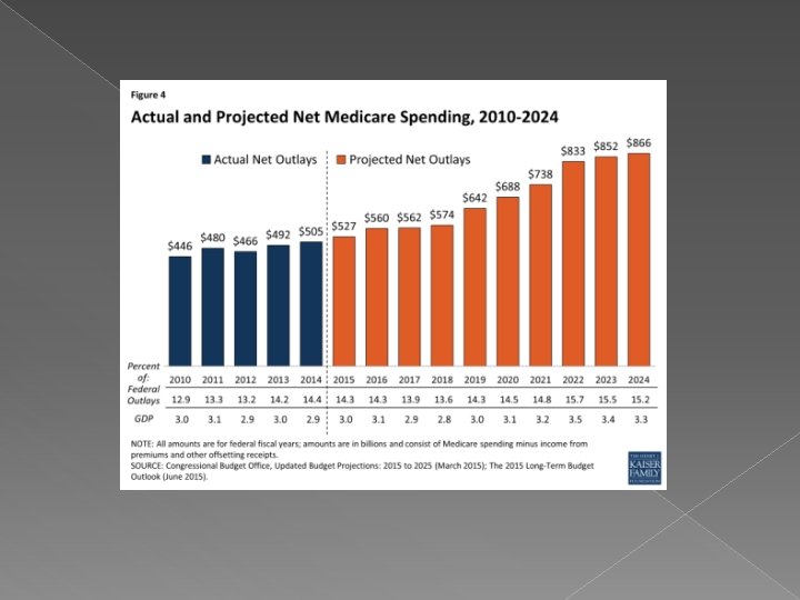 Medicare Cost Drivers Aging of the baby boomers Inflation in the healthcare industry Addition of prescription drug benefit to the program