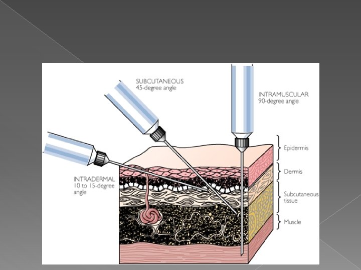 Comparison of Common Parenteral Routes of Drug Administration Intramuscular 90° Subcutaneous 45° Intravenous 25° Intradermal Epidermis Dermis Subcutaneous tissue Muscle 10°– 15°